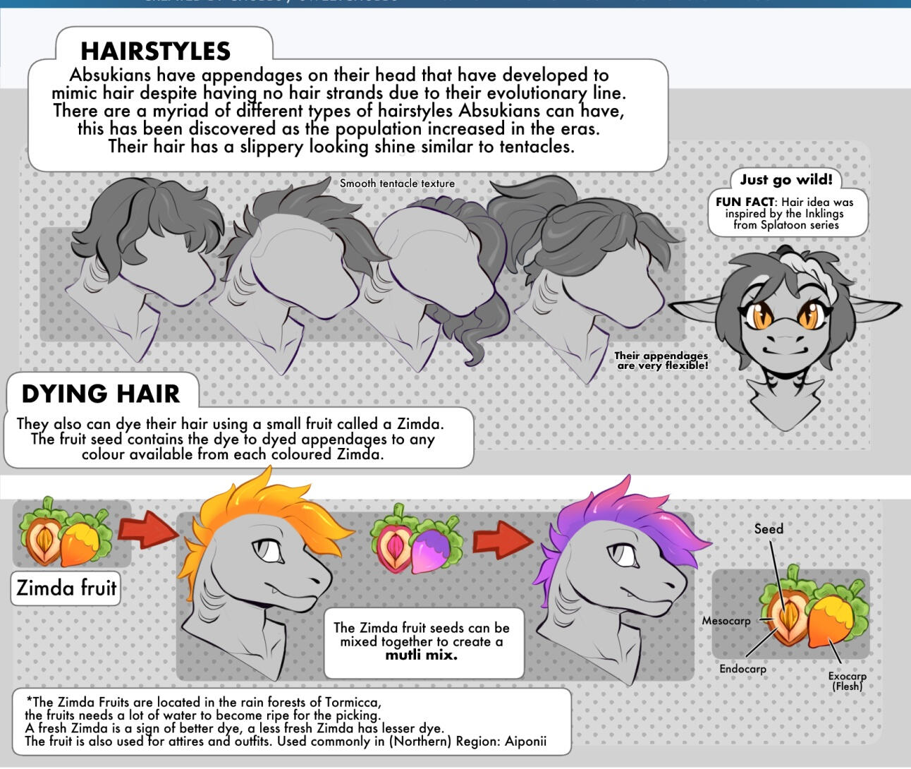 They also can dye their hair using a small fruit called a Zimda. The fruit's seed contain the dye to dye appendages to any colour available from each coloured Zimda.